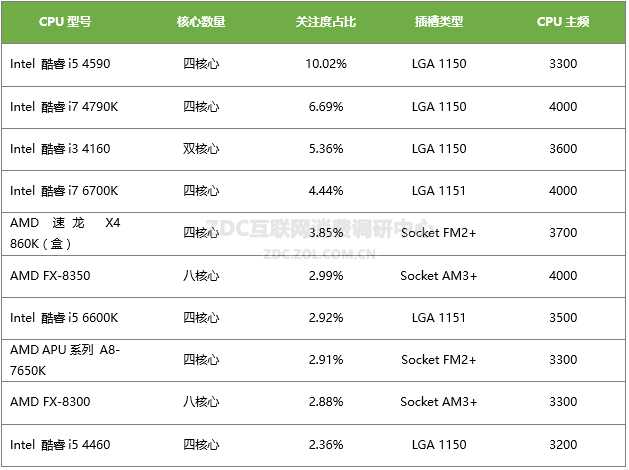 2015年11月中国的CPU市场上,Intel 酷睿系列产品成为了大赢家,占有多个热门产品席位。其中,Intel 酷睿 i5 4590以10.02%的高占比成为11月的最热门产品;Intel 酷睿 i7 4790K的关注比例为6.69%,排名第二;Intel 酷睿 i3 4160的关注比例为5.36%,排名第三;Intel 酷睿 i7 6700K以4.44%的关注比例排名第四。AMD产品中表现较好的有AMD 速龙 X4 860K、AMD FX-8350、AMD APU系列 A8-7650K以及AMD FX-8300,在热门产品中排名分别为第五、第六、第八和第九。