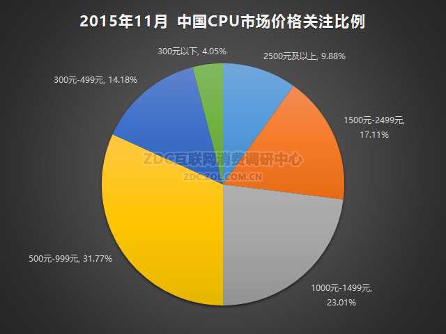 CPU市场相对来说是一个平价市场,2015年11月,关注度最高的价格区间为500元-999元,其关注度占比为31.77%;1000元-1499元价格区间产品的关注度为23.01%,1500元-2499元产品的关注比例为17.11%,300元-499元产品的关注比例为14.18%,2500元以上的产品关注比例为9.88%,300元以下产品的关注度占比为4.05%。