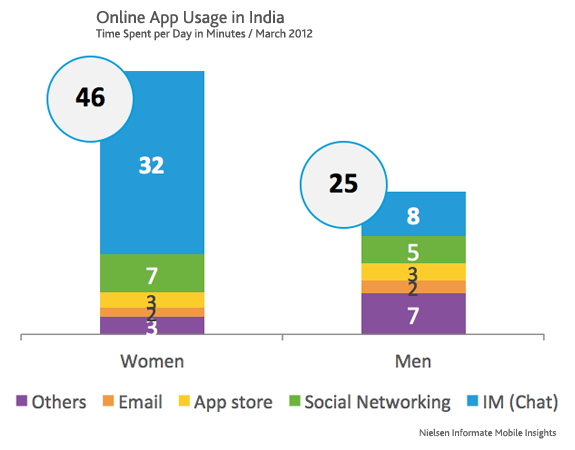 Nilesen发现在印度,女性在智能手机上所花的时间和男性一样长,但是两者的行为却差别迥异。