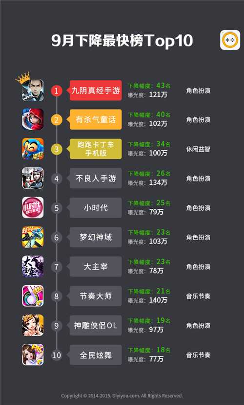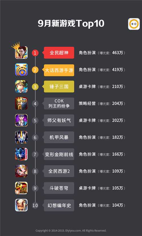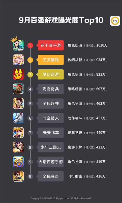 二、9月份百强手游曝光度Top 10与百强游戏类型分布