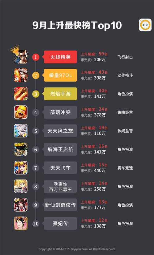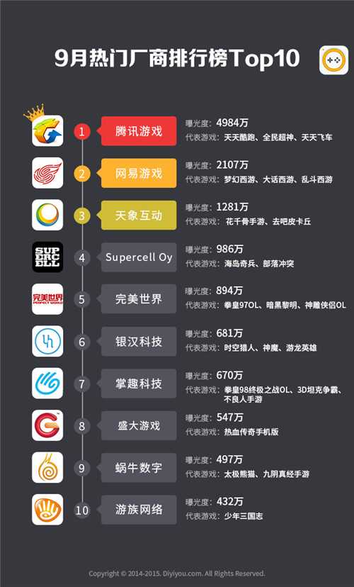 第一手游网2015年9月中国手游曝光度报告,通过对国内主流手机应用市场的每日下载量TOP100游戏的曝光量进行监测,罗列了新游入榜、游戏厂商和游戏升降榜,对热门游戏、热门游戏厂商、商店分发和用户情况进行了分析。力求能还原国内手游市场的真实情况与发展趋势,希望能为市场各方提供参考意见与建议!