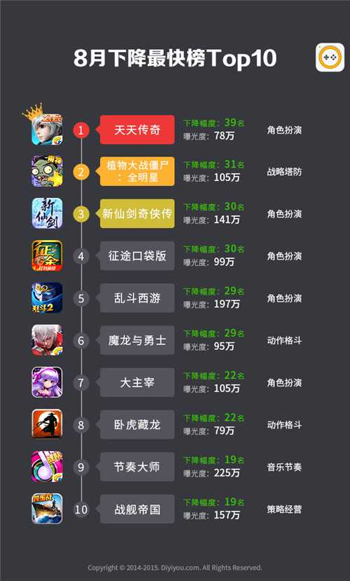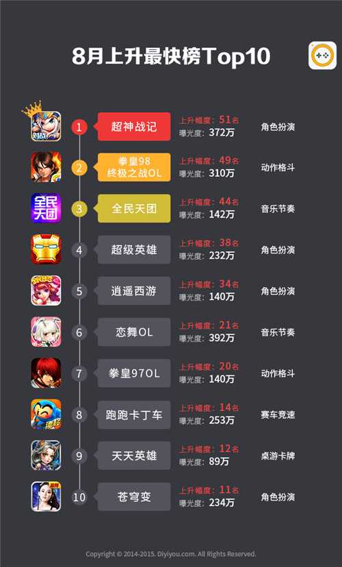 四、8月手游曝光度上升最快榜和下降最快榜