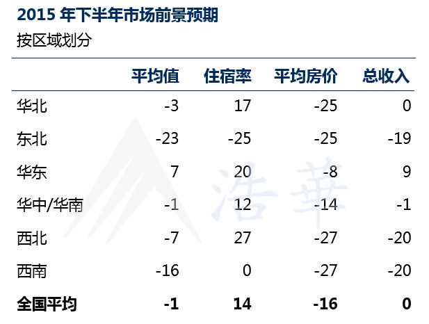同样回到指数上的分析。我们发现与2014年下半年相比,半数地区的酒店业者对本年度下半年其所在酒店的业绩预期都持积极的态度,表现为正向的平均景气指数。但是,东北地区的业绩预期在全国各地区中最为悲观,指数仅为-16,究其原因,近半数的东北地区受访酒店均预期其市场住宿率、平均房价和总收入这三项业绩指标在2015年下半年都会有所下降。