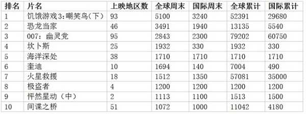 《007:幽灵党》以690万空降按照国际惯例最后公映的日本,总国际票房则达到6.075亿,是史上第35部跨过6亿线的电影。锤哥新片《海洋深处》领先北美一周驶向38个国际市场,载得1710万,前景不甚明朗。韩国250万票房最为突出,俄罗斯200万夺得冠军。