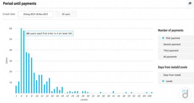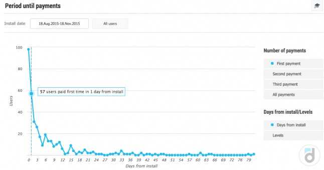 举个例子来说,让我们使用devtodev分析系统的报告“付费前的时期”。选择每个用户的首次付费时间(游戏邦注:你也可以选择第二次,第三次或所有付费时间,并且不用考虑序号),确定用户注册时间,并着眼于时间和他们首次付费的分布规律。