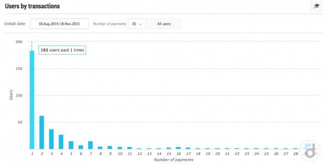 为了帮助你更好地理解基于付费用户的消费次数的付费用户分布规律,我们创造了“基于交易的用户”报告。这将帮助你明确多少用户进行了一次交易,两次交易等等。