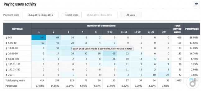 第一次消费的规模通常都较小。你能在“付费用户活动”报告中看到这点: