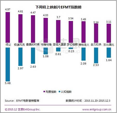 根据EFMT电影营销智库监测显示,下周将上映的15部新片中,两部动作片《师父》和《极速风流》的购票指数超过了同期的所有喜剧片和爱情片,占据了指数榜的前两位。徐浩峰的上一部影片《倭寇的踪迹》虽然获得了业内的广泛认可,但写实派的动作设计并未赢得观众,该片2012年2月份上映,票房不足40万,此次启用明星阵容,制作水准也有了大幅提升,根据购票指数来看,观众对这一部新作充满了期待,票房前景值得期待。
