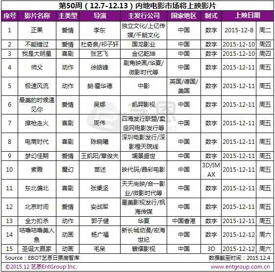 下周将会是2015年最为拥挤的档期之一,根据EBOT艺恩日票房智库显示,共有15部新片都会在下周上映,周五当日10部电影密集登陆院线。从类型来看,依然是爱情、喜剧类电影占大多数:5部爱情片《正果》、《不能错过》、《最美的时候遇见你》、《梦幻佳期》、《北京时间》,4部喜剧片《我是大明星》、《擦枪走火》、《电商时代》、《东北偏北》,3部动作片《师父》、《极速风流》、《全力扣杀》,2部动画片《咕噜咕噜美人鱼》、《圣诞大赢家》和1部魔幻片《紫霞》。