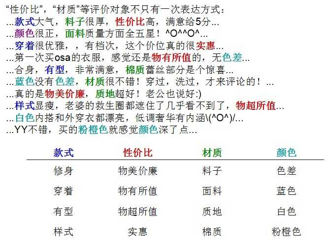 图1:淘宝新款秋季女装的评价简述。其中“款式”、“材质”和“颜色”就是评价对象,红色表示对女装的正面评价,靛色表示负面评价。