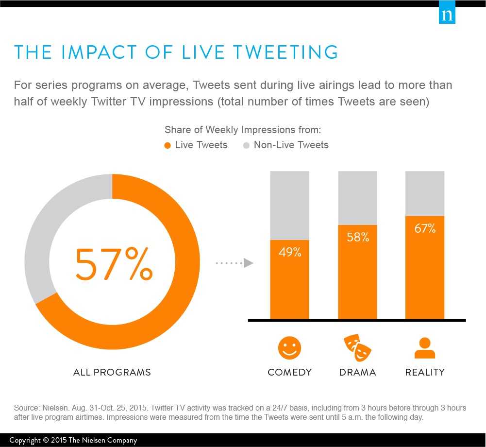 电视观众经常在看直播节目时使用社交媒体,根据Nielsen最近的研究,直播节目时发布的推特不仅占每周系列节目推特的主要部分,而且更有影响力。这些推特对提高点播节目、DVR和流视频收视也很有价值。