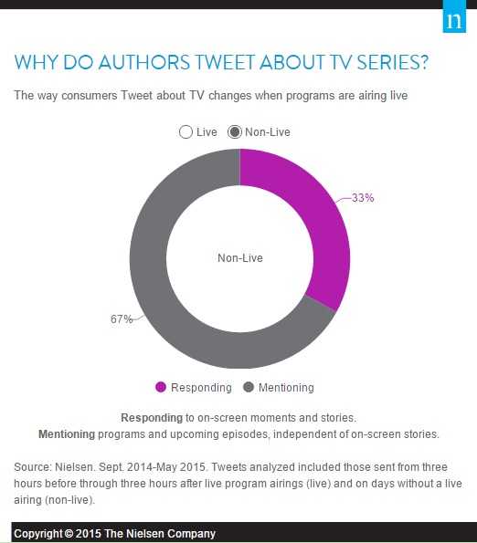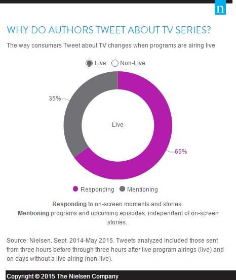 因为电视观众在Twitter上收看多个节目相关推特,他们的发布行为也会有所变化。Nielsen分析了2014年到2015年广播电视季Twitter上的电视活动,发现系列节目直播时有两点变化。