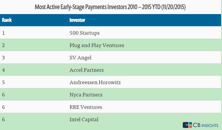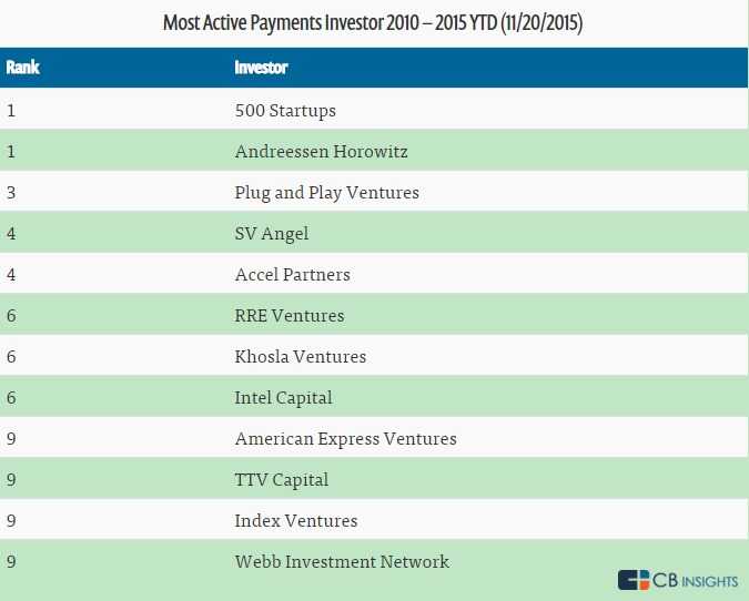 500 Startups 和 Andreessen Horowitz是支付初创企业最活跃的投资者,Plug and Play Ventures排在第三位,SV Angel 和 Accel Partners并列第四位。