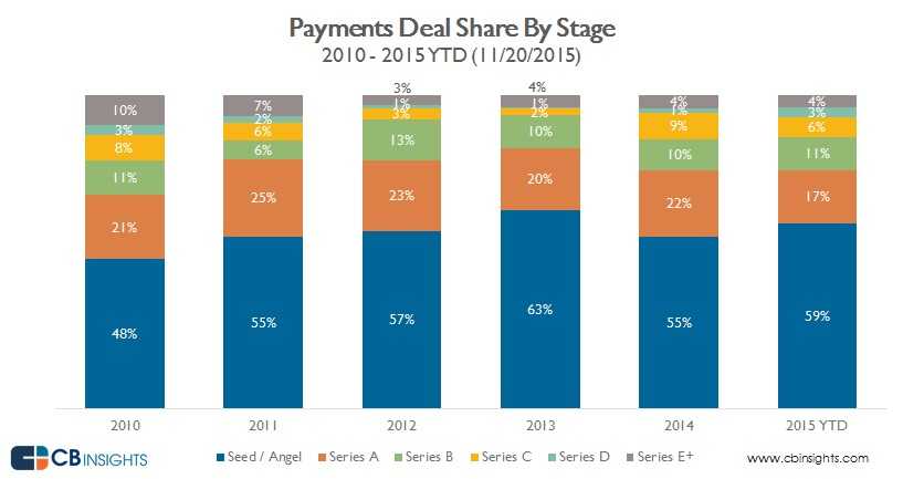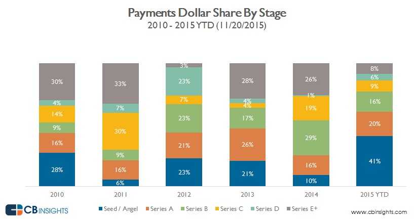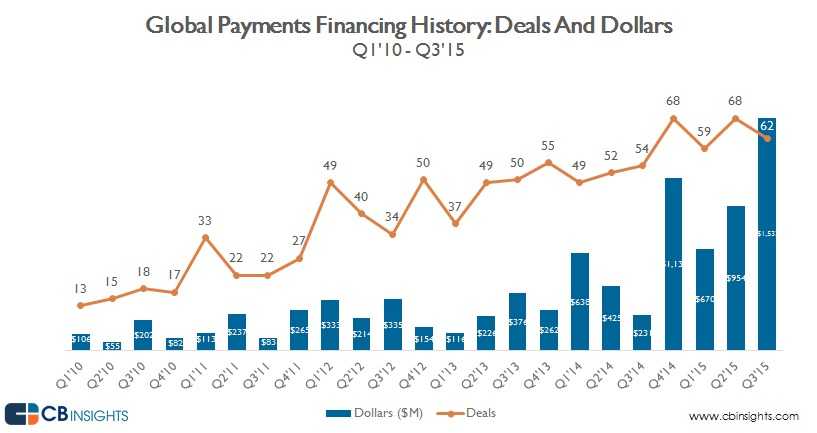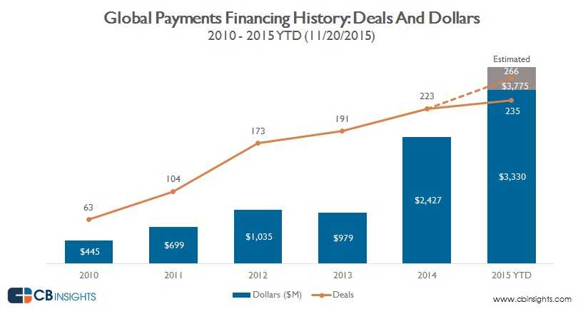 2015年(截至11月20日),私营支付企业融资已经超过33亿美元,年增幅37%,但是交易量只增长了5%。下图显示了6年来的投资情况,和2010年的4.45亿美元相比增长648%。
