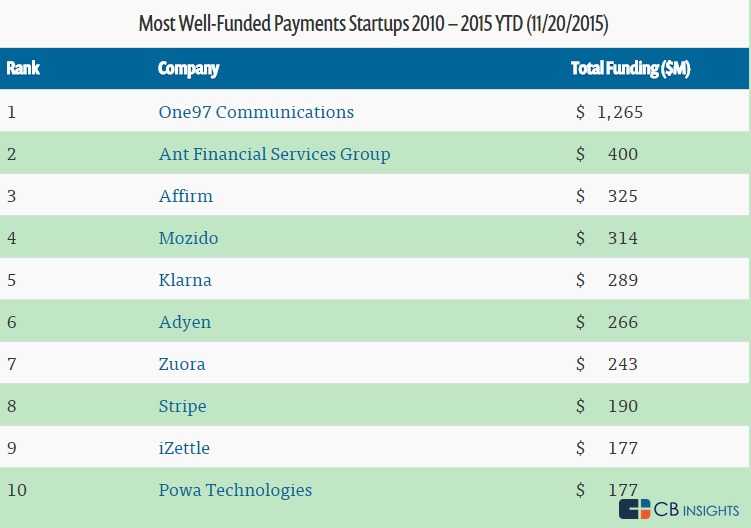 十强支付初创企业的融资额增长都超过1.50亿美元。One97 Communications投资增长最高,获得超过12亿的融资,几乎是第二位阿里巴巴金融服务分支Ant Financial Services投资的三倍。