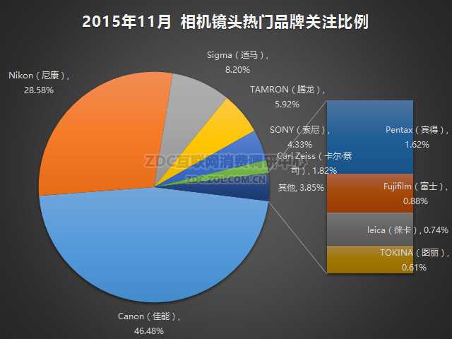 2015年11月中国相机镜头市场上,佳能以46.48%的关注比例领跑品牌榜,尼康的市场关注比例为28.58%,稳坐第二位。适马的关注比例为8.20%,排名第三;腾龙的关注度占比5.92%,索尼占比4.33%。六到十名的品牌分别是卡尔 蔡司、宾得、富士、徕卡以及图丽,关注比例都不足2%。