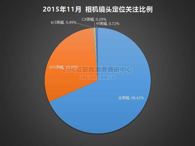 2015年11月中国的相机镜头市场上,全画幅镜头吸引了68.42%的关注比例,最受用户的欢迎;其次,APS画幅的镜头关注比例为30.08%,其它画幅类型的镜头还有4/3画幅、CX画幅以及中画幅镜头,关注比例都不足1%。