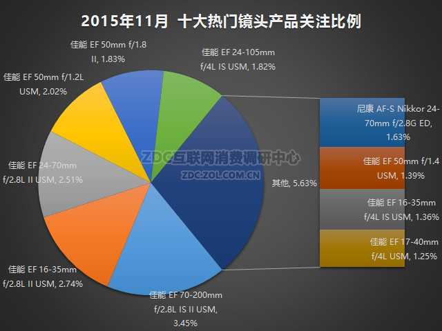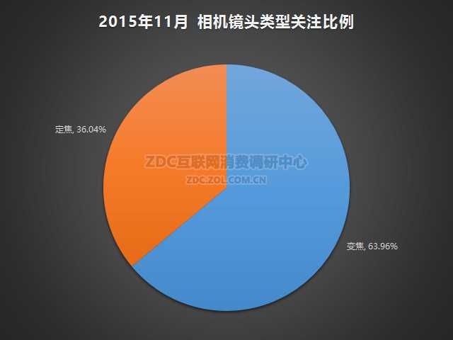 2015年11月中国的相机镜头市场上,变焦镜头的关注比例有63.96%,而定焦镜头的关注比例只有36.04%。