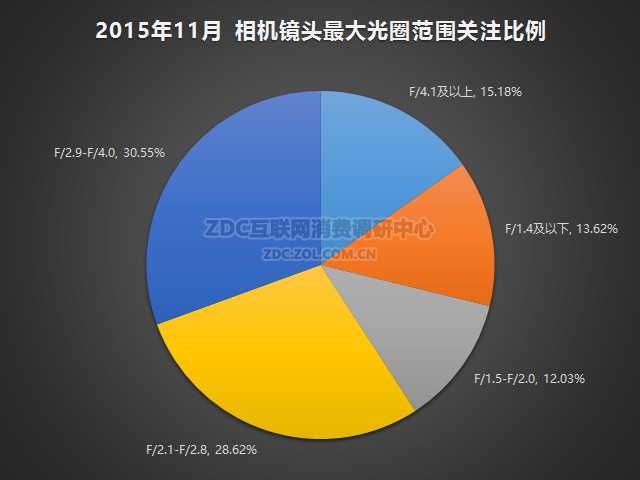 2015年11月中国的相机镜头市场上,最大光圈范围在F/2.9-F/4.0范围内的镜头产品关注比例为30.55%,F/2.1-F/2.8的镜头关注比例为28.62%,F/4.1及以上的镜头关注比例为15.18%,F/1.4及以下占比13.62%,F/1.5-F/2.0的镜头产品关注比例为12.03%。