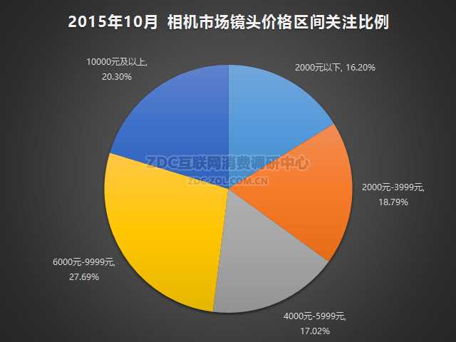 价格方面,2015年11月中国的相机镜头市场上,价格在万元以下的产品最受市场的关注。其中6000元-9999元价位产品的关注比例为27.69%,4000元-5999元产品的关注比例为17.02%,2000元-3999元产品占比18.79%。而相对便宜的2000元以下产品关注比例只有16.20%,10000元以上的镜头产品关注比例为20.30%。
