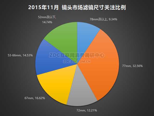 2015年11月中国的相机镜头市场上,滤镜尺寸为77mm的产品最受欢迎,关注比例为32.56%,滤镜尺寸为67mm的产品关注比例为16.62%,滤镜尺寸在52mm及以下的产品关注比例为14.74%,滤镜尺寸为53-66mm的产品的关注度占比为14.53%,滤镜尺寸为78mm及以上的产品关注比例为9.34%。