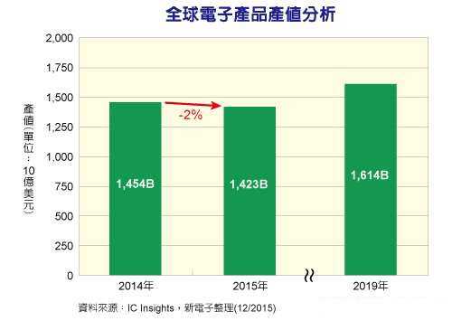 IC Insights:预计2015年全球电子产品总产值为1.4万亿美元 根据IC Insights统计,2015年全球电子产品总产值预估为1兆4,230亿美元,较2014年下滑2%,是2001、2002及2009年后,第四次出现下滑。尽管如此,在物联网、汽车和医疗电子发展日益蓬勃的驱动下,2019年总产值预估仍可望跃升至1兆6,140亿美元。 更多阅读:IC Insights:2015年上半年全球半导体供应商Top20IC Insights:2018年全球半导体出货量超过1万亿IC Insights:2015年Q4全球智能手机出货量达到4.35亿支IC Insights:预估2015年全球物联网装机量达132亿IC Insights:预计2014年全球医疗系统半导体销售额达49亿美元IC Insights:2013年全球半导体成长率排名:海力士第一 联发科第二胜高通IC Insights:2013年全球半导体研发费用排行榜IC Insights:预计2013年全球芯片设备资本开支英特尔三星占42%IC Insights:2021年全球半导体销售额将增长24%IC Insights:预计2020年全球DRAM销售额达到645.55亿美元IC Insights:预计2019年半导体在电子系统占比下降至26.4%IC Insights:预测2015年半导体产业资本支出达到690亿美元IC Insights:2021年全球半导体供应商十强IC Insights:2021年全球半导体供应商十强IC Insights:2026年汽车行业占IC市场的份额将增长到9.9%