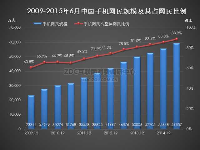 来自CNNIC(中国互联网络信息中心)的数据显示,截至2015年6月底,中国网民规模已经达到6.68亿,其中手机网民规模为5.9357亿,在整体网民中占比88.9%。