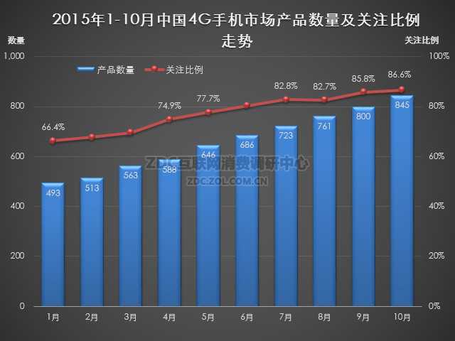 自2014年三大运营商全面开始4G业务之后,随着2015年4G资费的下调,越来越多的用户开始关注并选择4G手机。从市场在售的机型数量来看,2015年10月达到845款,较1月份增长了352款,同时用户关注度也从1月的66.4%攀升至10月的86.6%,增长了20个百分点。