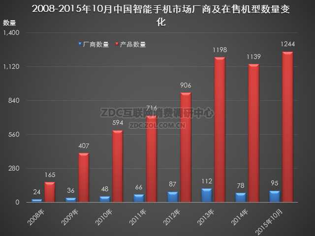 ZDC监测数据显示,2008-2015年中国智能手机市场发展迅速,2008年参与竞争的厂商数量不足30家,2013年则突破百家,之后市场进入混战及快速洗牌时期,截至2015年10月,智能手机市场参与竞争的厂商数量仍在100家以下。从在售机型来看,自2013年智能手机市场在售的手机数量已经超过1000款,2015年达到近三年最高,超1200款。