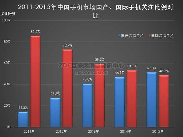 ZDC监测数据显示,2015年中国手机市场上,国产手机的用户关注度达到51.3%,超五成,已经超过了国际品牌。这意味着国产手机厂商的影响力正在赶超国际厂商。