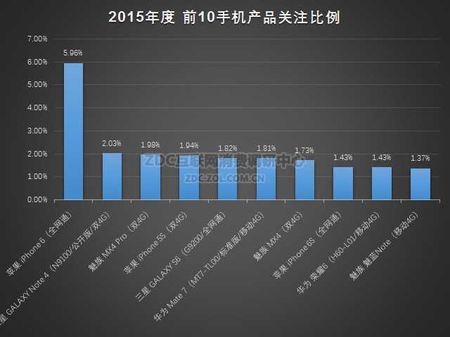 从产品来看,2015年度中国手机市场上,苹果iPhone 6 (全网通)以5.96%的关注比例独占鳌头,用户关注度最集中。三星Galaxy Note 4(N9100/公开版/双4G)以2.03%的关注比例位居第二。排在第三至第十的产品关注比例均在2%以下,集中在1.3%-2%之间。