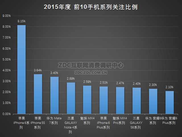 从产品系列来看,2015年度,苹果iPhone 6系列以8.15%的关注比例高居榜首,成为最受用户青睐的产品系列,且领先优势显著,其他上榜产品系列关注度均在4%以下。