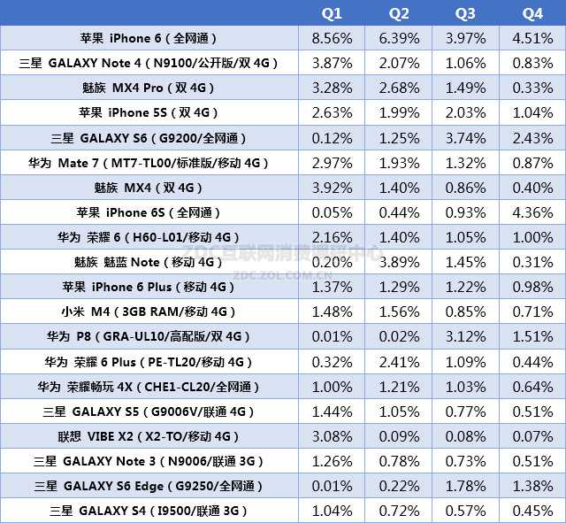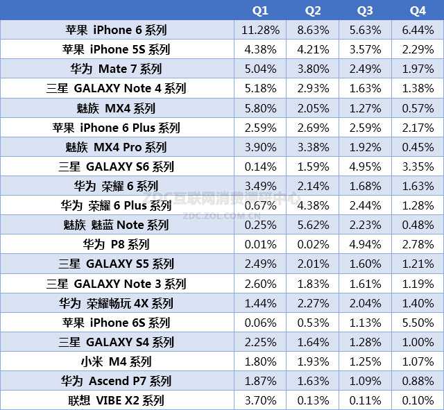苹果iPhone 6(全网通)连续四个季度稳居榜首