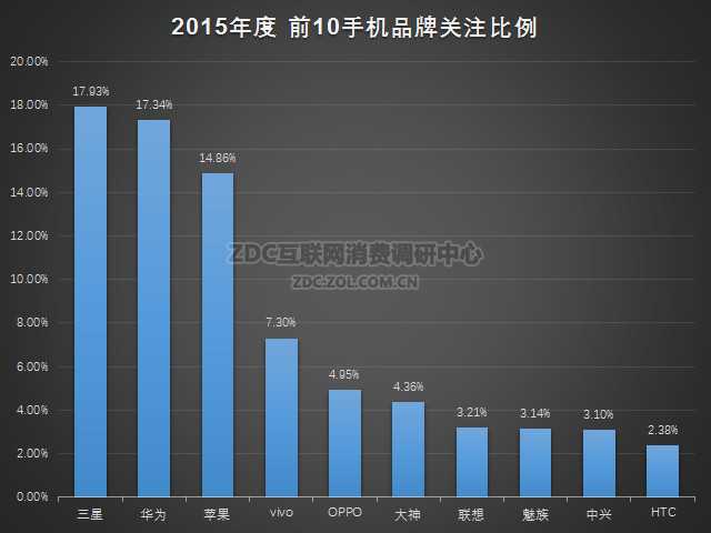 ZDC统计数据显示,2015年度中国手机市场上,三星以17.93%的关注比例成为用户关注度最高的品牌。华为紧随其后,关注比例为17.34%,仅落后0.59个百分点。苹果位居第三,关注比例接近15%。排在第四至第十的品牌关注度分布在2%-8%之间,差距较小。vivo在第二阵营中关注比例优势较为明显。