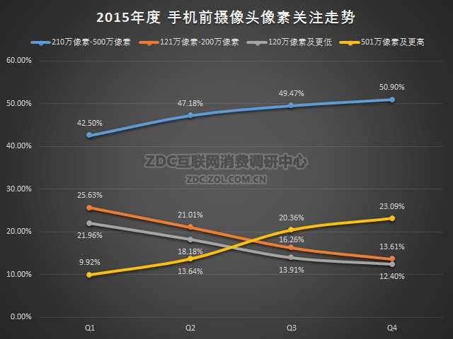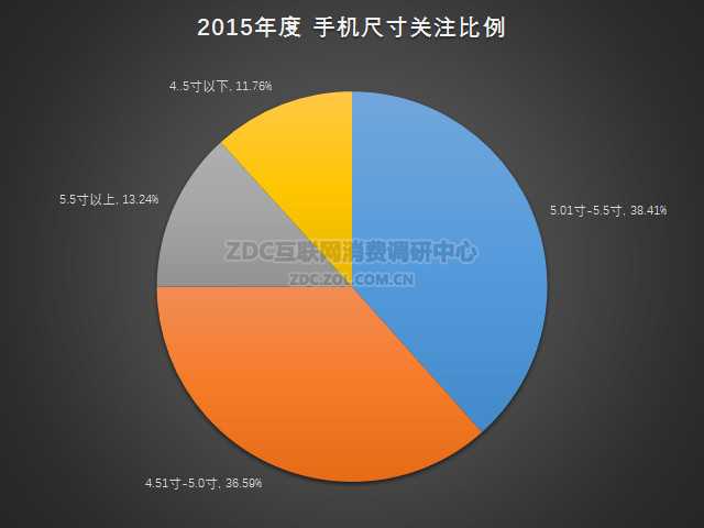 从2015年四个季度走势来看,4.6-5.0英寸屏幕的智能手机关注度稳步增长,而5.5英寸以上超大屏手机关注度则相对平稳。另外,从ZDC的网民调查来看,打算购买4.6-5.0英寸屏幕机型的网民占比超五成,不购买5.5英寸以上超大屏手机的网民中,超七成因为其屏幕太大,不好握持。从未来来看,能带来更好使用体验的4.6-5.0英寸屏幕机型将成为市场的主导。
