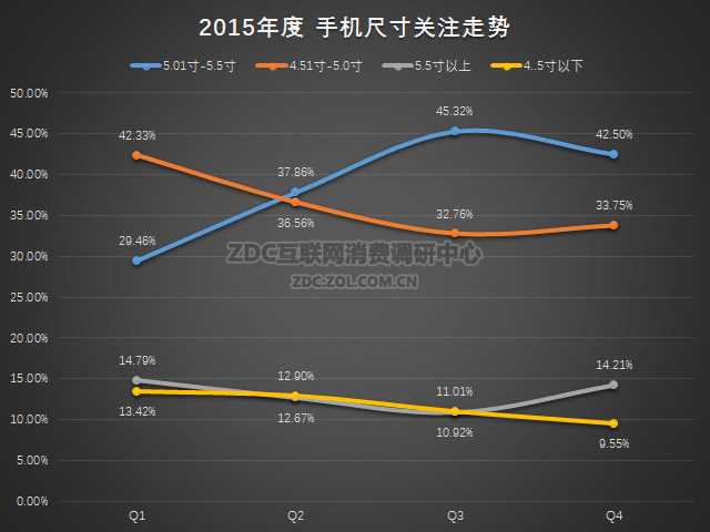 从走势来看,2015年度,搭载5.01-5.5英寸屏幕的手机关注度呈先升后降走势,Q3达到最高点45.32%,之后小幅下降2.82%,但仍在40%以上。4.51-5.0英寸屏幕的机型关注度则整体呈下降走势,从Q1的42.33%降至Q3的32.76%,大降近10个百分点,Q4微幅回升。
