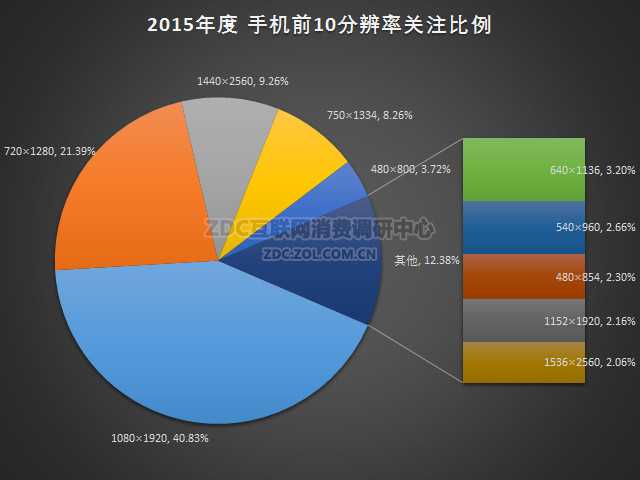 从2015年度走势来看,采用1080*1920分辨率屏幕的机型关注度呈直线上涨走势,Q4涨至45.26%,较Q1上涨了近11个百分点,且以绝对优势成为用户关注的焦点。