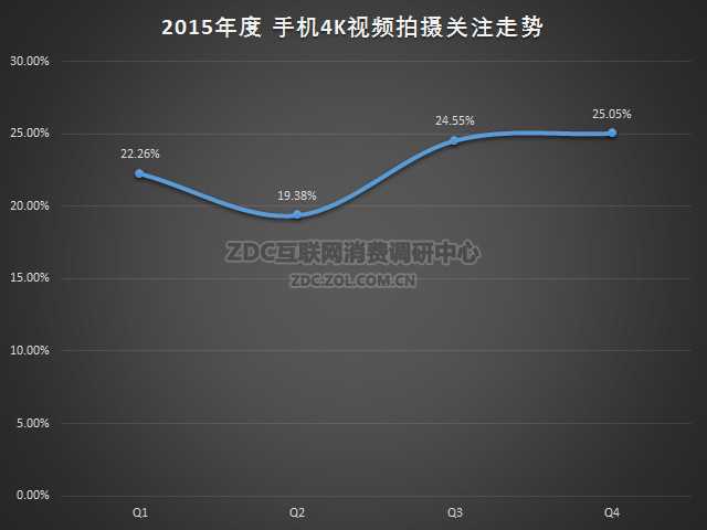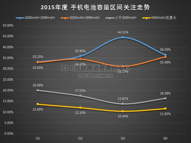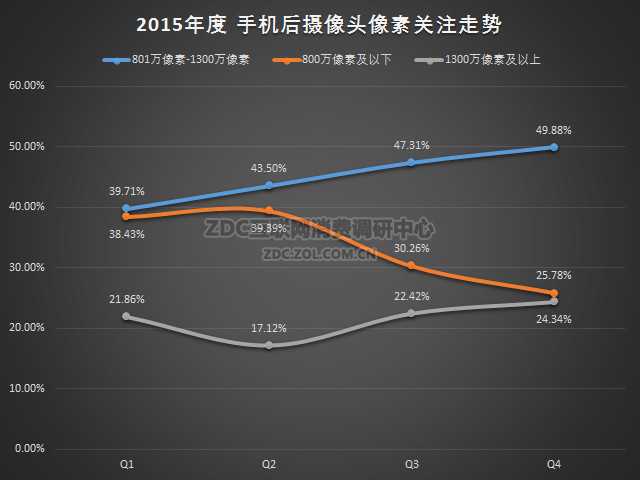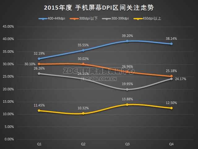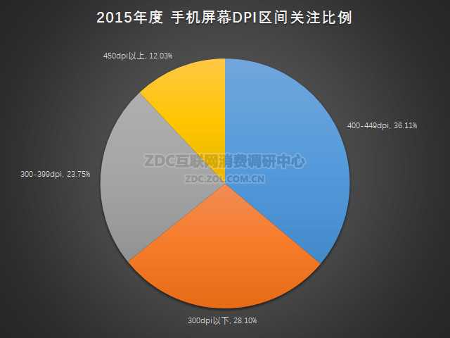从走势来看,2015年度,采用400-449dpi的手机关注度呈先升后降的走势,尤其在Q3达到39.20%,逼近四成,之后小幅下滑1.06个百分点。300dpi的手机关注度责成直线下滑的走势,Q4降至25.18%。