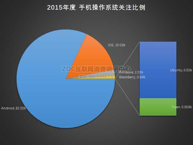 2015年度中国手机市场上,搭载Android系统的手机获得82.02%的关注比例,占据绝对主流,其次为苹果iOS系统,获得15.03%的关注比例。Windows Phone系统关注度为2.01%。整体来看,Android系统一统江湖的局面短期内仍将持续。