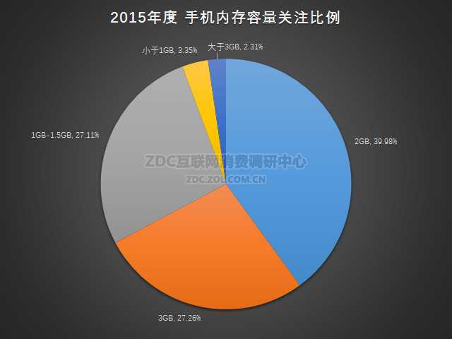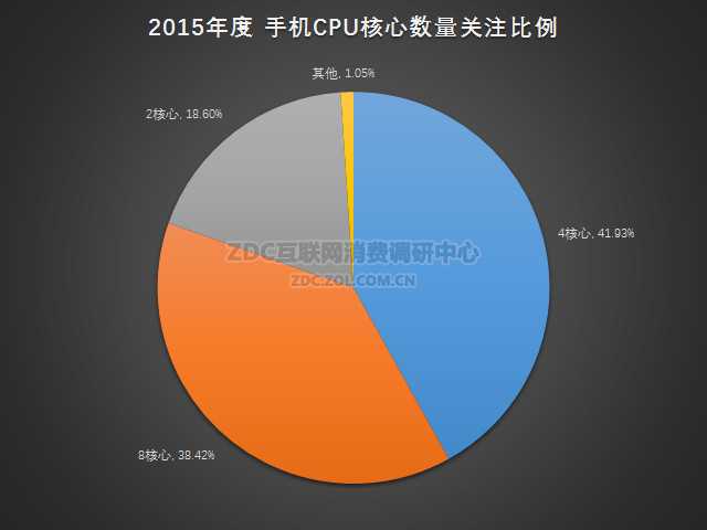 2015年度,搭载四核心处理器的机型获得41.93%的关注比例,为用户关注的主流。其次为八核心机型,关注比例为38.42%,接近四成。双核机型关注度目前不足两成。