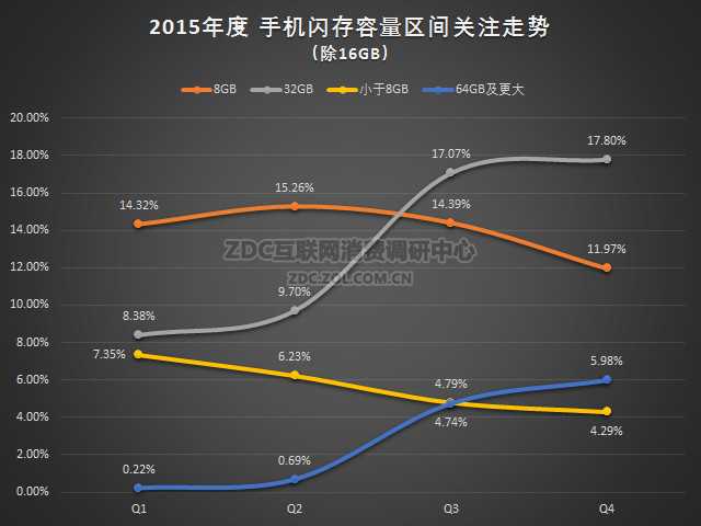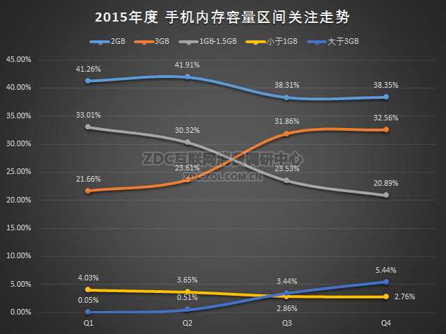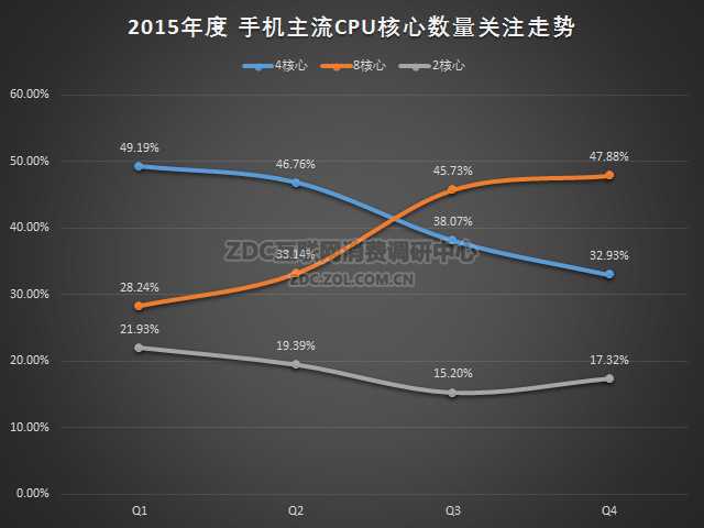 从走势来看,2015年度,八核机型关注度呈直线上升走势,Q4其关注比例达到47.88%,较Q1增长了近20个百分点。四核心机型关注度则呈直线下滑态势,Q4降至32.93%,较Q1下降了16.56个百分点。双核机型关注度呈整体下降走势。