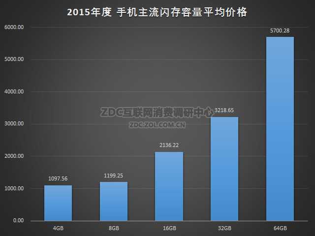 2015年度,采用64GB闪存的机型均价最高,达到5700.28元。搭载32GB闪存的手机均价超3000元,为3218.65元。支持16GB闪存的手机均价为2136.22元。整体来看,手机闪存越高,均价也越高。