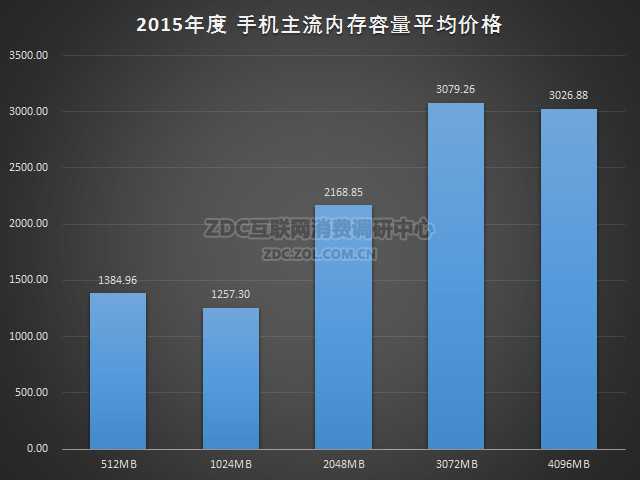 2015年度,采用3072MB即3GB内存的手机均价最高,达到3079.26元。其次为搭载4096MB即4GB内存的机型均价,也在3000元以上,为3026.88元。搭载2048MB即2GB内存的机型均价为2168.85元。整体来看,1024MB即1GB内存机型均价最低,为1257.30元。