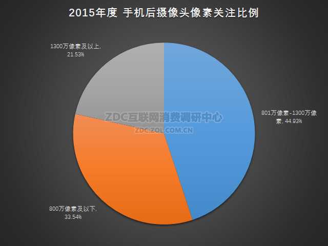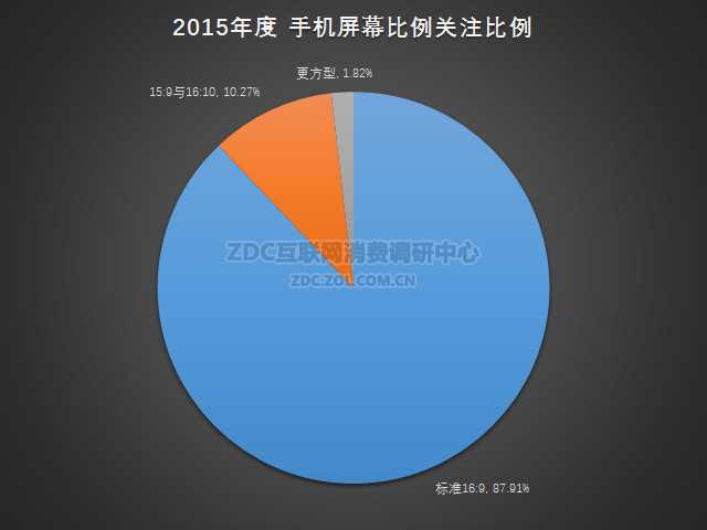 从手机屏幕比例来看,标准16:9比例的屏幕最受用户欢迎,2015年度其关注比例达到87.91%,接近九成,成为用户关注的绝对主流。15:9与16:10比例屏幕的手机关注比例在一成左右。