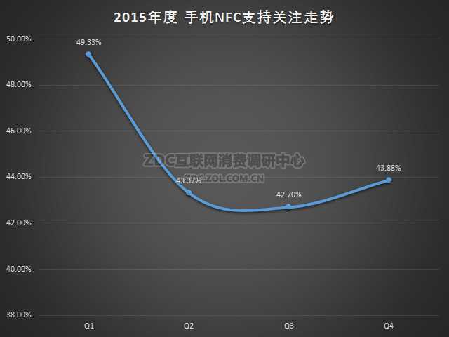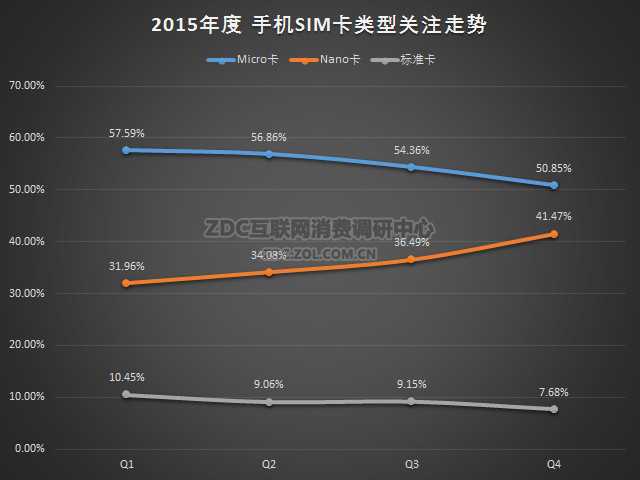 从2015年度走势来看,Micro卡关注度呈直线下滑走势,Nano卡关注度则直线上升,与Micro卡关注度此消彼长。Q4来看,Micro卡关注度降至50.85%,Nano卡关注度则涨至41.47%,二者差距持续缩小。