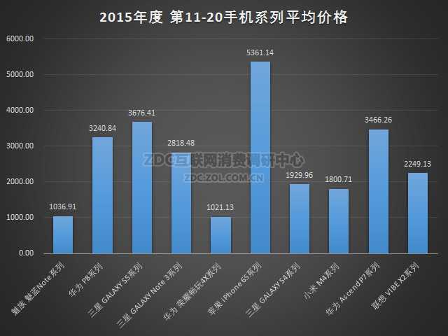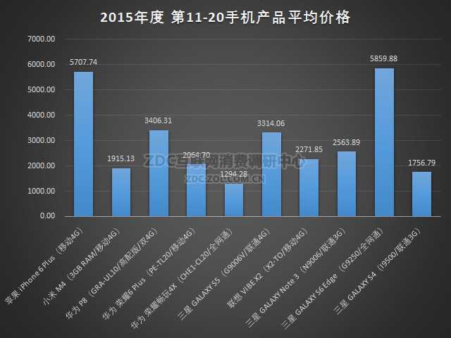 2015年度,第11-20产品中,排在第11位与第19位的苹果iPhone 6 Plus (移动4G)与三星GALAXY S6 Edge(G9250/全网通)均价均在5500元以上,远高于其他产品。华为P8与三星GALAXY S5两款产品均价分布在3000-3500元之间。还有三款产品均价分布在2000-3000元之间。华为荣耀畅玩4X均价最低,为1294.28元。