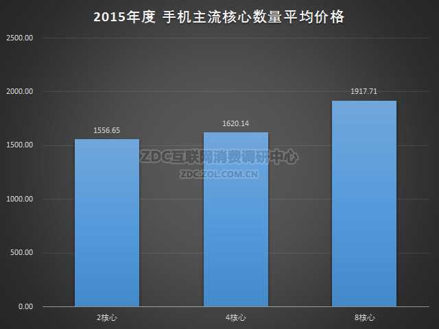 2015年度,搭载八核心处理器的手机均价最高,为1917.71元。其次为四核机型,均价1620.14元。双核机型均价最低,在1500元左右。