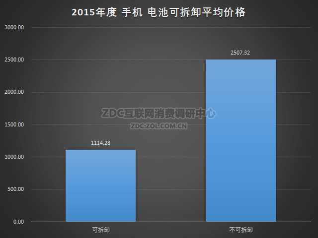 2015年度,中国手机市场上,在售的1300余款机型中,采用不可拆卸电池设计的机型占据41%左右。从均价来看,采用不可拆卸电池设计的机型均价为2507.32元,较采用可拆卸电池手机的均价高近1400元。