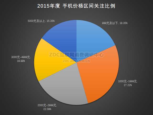 从价格段来看,2015年度,中国手机市场上,1000-1999元机型最受青睐,获得27.22%的关注比例。其次为2000-2999元价格段机型,关注度为22.09%。999元及以下、3000-4999元、5000元及以上机型关注度均在20%以下。