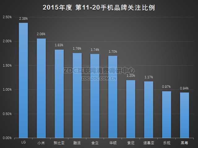 在第11-20品牌中,LG与小米分别以2.38%、2.06%的关注比例排在第11、12位,第13至20位品牌关注比例均在2%以下。乐视、黑莓关注比例则不足1%。整体来看,第11-20品牌中有五家来自国产厂商阵营。